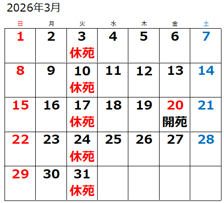 ※ただし、火曜日が祝日の場合は、翌日水曜日が休苑日となります。 - 1月4日~5日